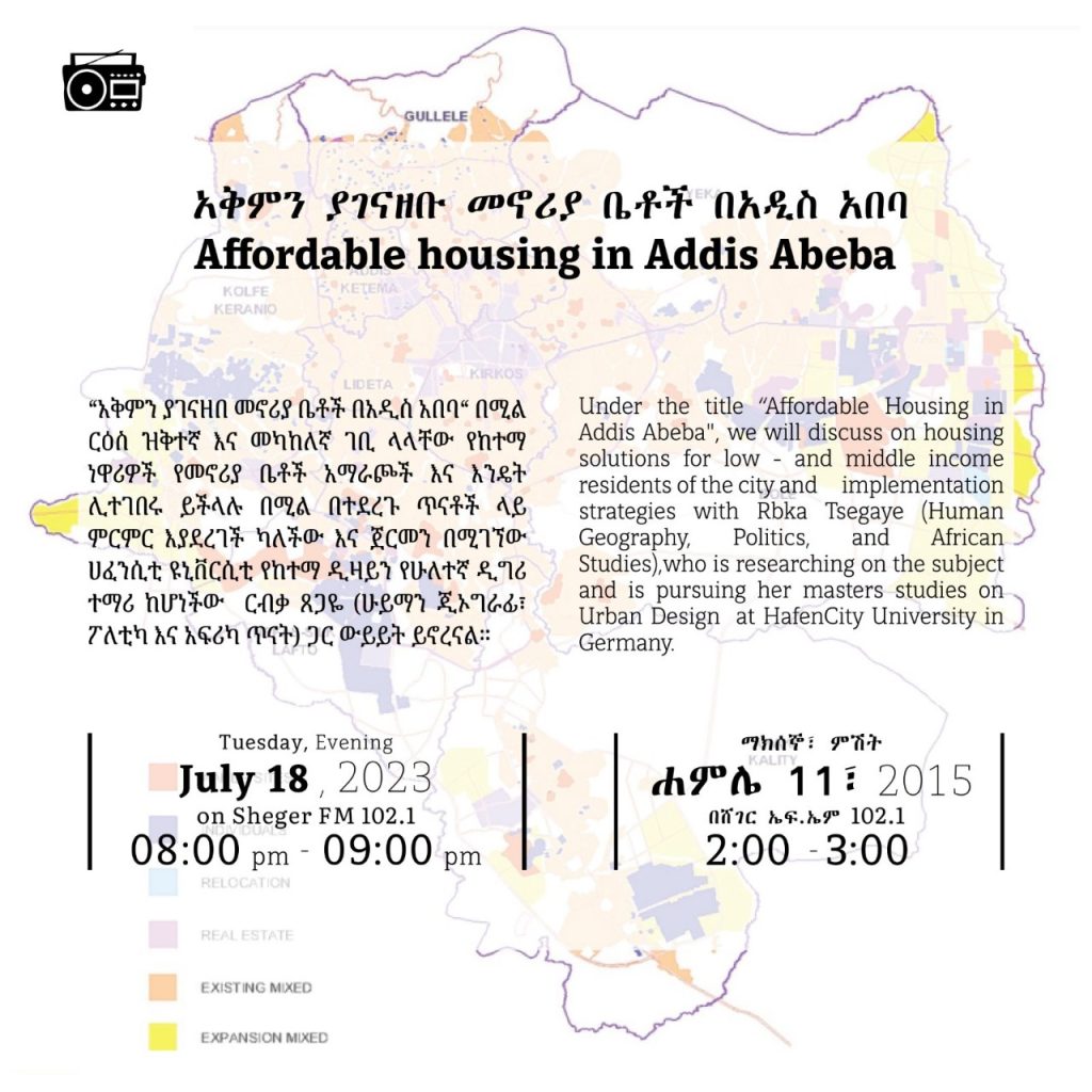 We will discuss on housing solutions for low – and middle income residents of the city and implementation strategies with Rbka Tsegaye(Human Geography, Politics, and African Studies),who is researching on the subject and is pursuing her masters studies on Urban Design at HafenCity University in Germany.
