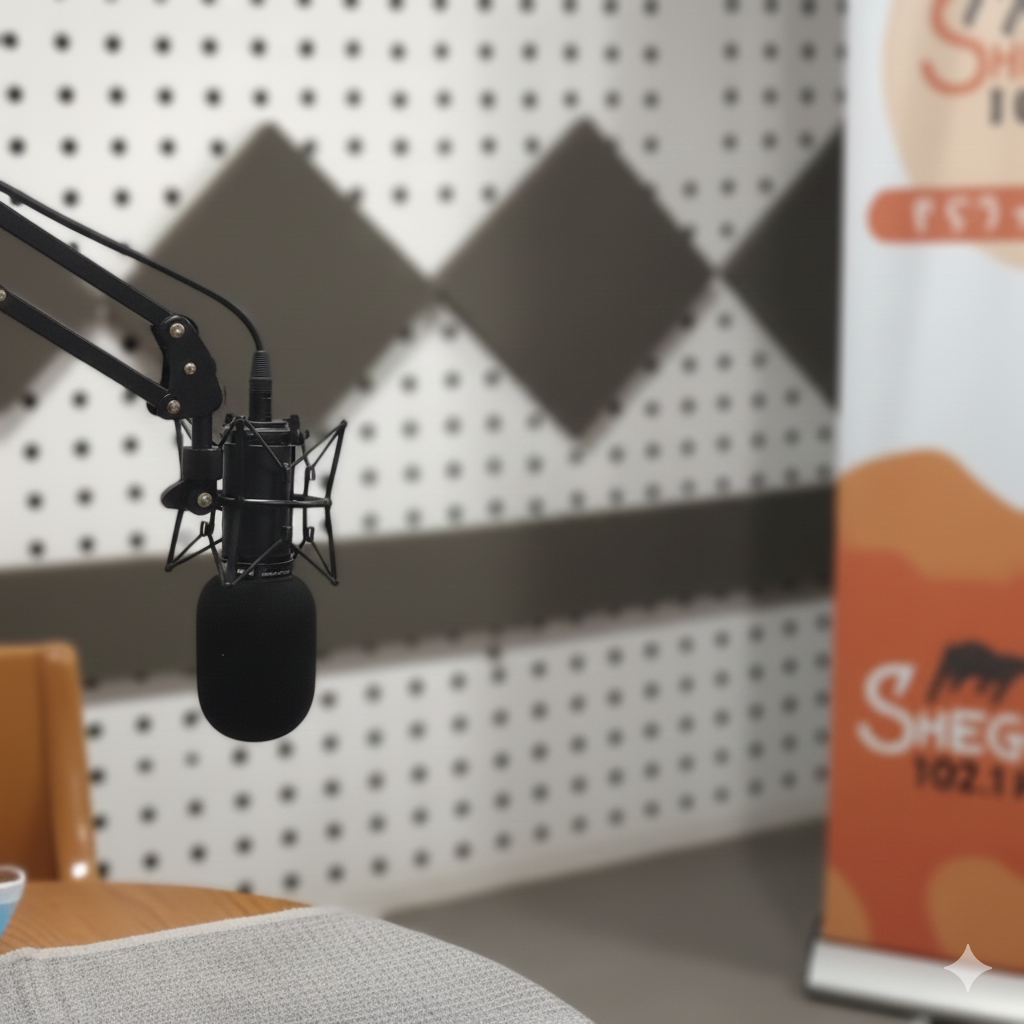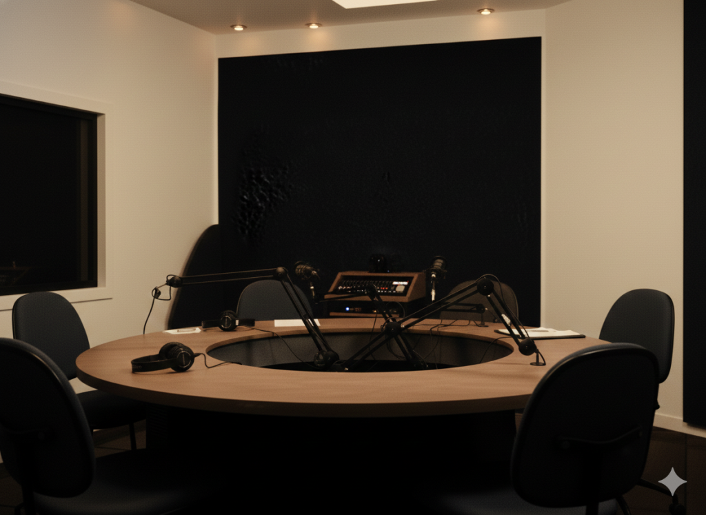 A fully equipped studio space for professional audio and visual productions, including podcasts, interviews, and digital content creation.